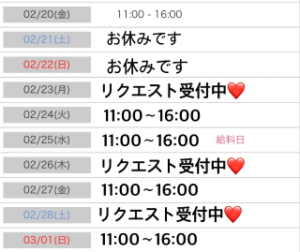 こんにちは😊 旦那さま❤️ 2月の出勤予定です❤️ ローズマリーで お待ちしております❤️
